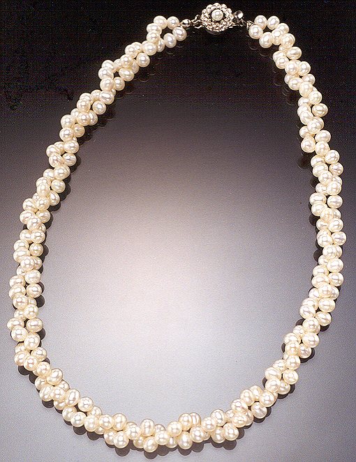 "Melissa, Sarah" "Melissa" 2 strand elegant twisted freshwater 5-6 mm pearls. Special technique holds strands in alluring twisted position. "Sarah" pearl earrings, 5 mm freshwater pearl and sterling silver rondelle bead, suspended on a fleur de lis sterling silver leverback. Available Lengths