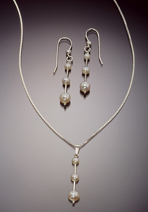 "Charlize, Nikki" "Charlize" pearl necklace, drop pearl pendant, 3, 4, 5 mm freshwater pearls suspended from sterling silver bars, on sterling silver box chain. "Nikki" pearl earrings, 3, 4, 5 mm freshwater pearls suspended from sterling silver bars on french wire earrings. Available Lengths