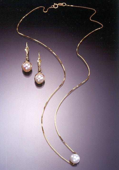"Cindy, Michelle" "Cindy" single pearl necklace, lovely 7.5-8 mm white pearl suspended on shimmering 14K gold box chain, the perfect accessory for any occasion. "Michelle" pearl earrings, 6.5 mm pearl 14K gold bezel drop, suspended on a 14K gold fleur de lis leverback. Available Lengths