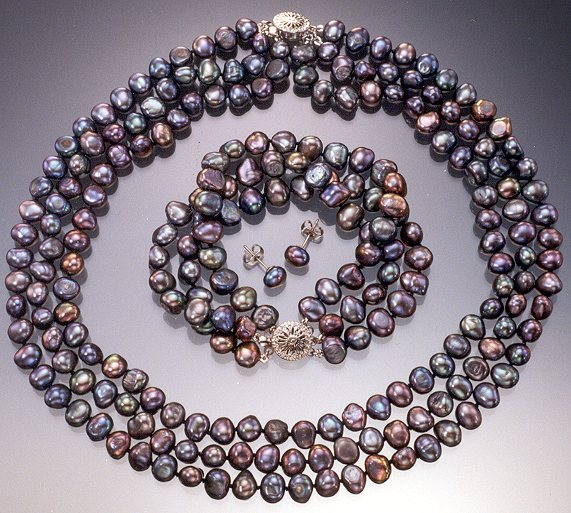 "Halle, Claudia, Liv Set" "Halle" pearl necklace and "Claudia" pearl bracelet, triple strand nugget freshwater pearls, shimmer with every movement, graduated 7-9 mm, hand knotted between each pearl. Incredible versatility - wear flat 17" or twisted into 14" choker (see below). "Liv" pearl earrings, freshwater pearl, 7-9 mm, surgical steel posts. Available Lengths