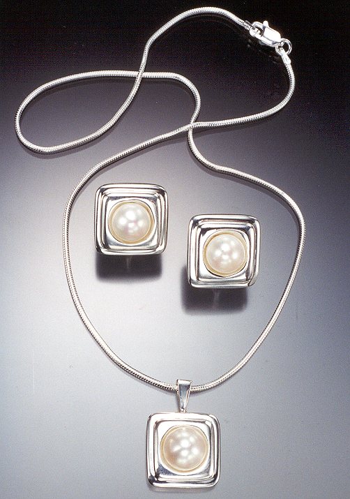 "Rene, Claire" "Rene" pearl necklace, dazzling 9 mm freshwater pearl, set in 17 mm sterling silver bezel pendant, on 14 mm sterling silver snake chain, finished with a sterling silver lobster clasp. "Claire" pearl earrings, dazzling 9 mm freshwater pearls, set in 17 mm sterling silver bezel, with sterling silver omega back and post. Available Lengths